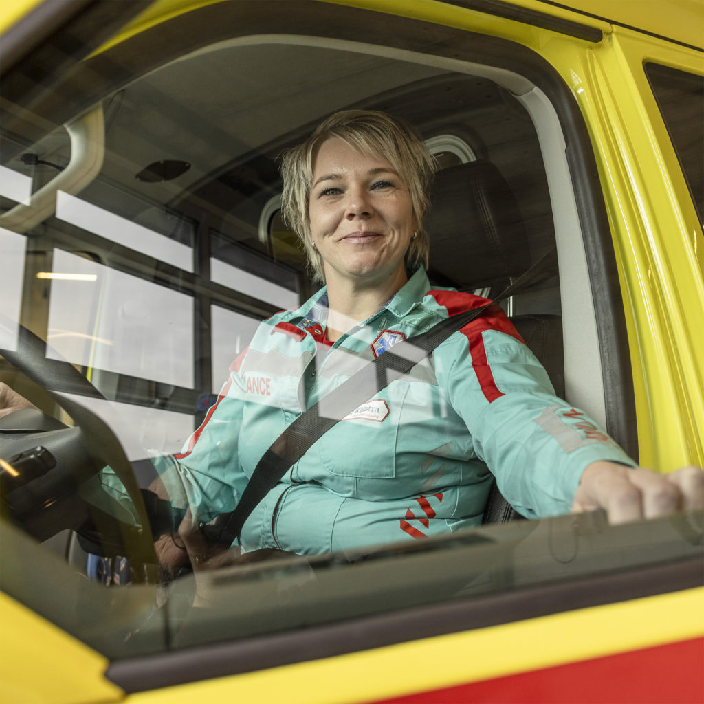 Met kleine dingen het verschil maken. Daar haalt Teikje de Jong voldoening uit in haar werk als chauffeur bij ritten voor de geplande ambulancezorg. “Om het patiënten in de auto zo aangenaam mogelijk te maken, is meer nodig dan rustig rijden en weinig remmen. Soms zijn ze misselijk, of heel ziek, dan scheelt het echt om bij rotondes, verkeersdrempels en op- en afritten bepaalde technieken toe te passen. Ik heb veel geleerd op dat vlak. In uitzonderlijke gevallen doet zich onderweg een acute situatie voor. Dan zet ik de auto aan de kant om de verpleegkundige achterin te assisteren.”